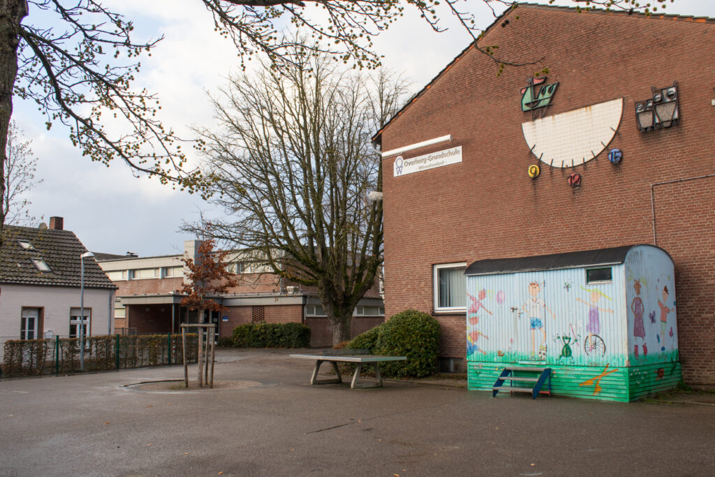 Die Overberg-Grundschule in Winnekendonk mit Turnhalle im Hintergrund und TT-Platten aus Stein auf dem Schulhof.
